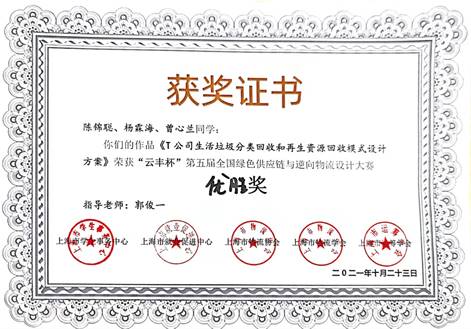 全国绿色供应链与逆向物流设计大赛,进入决赛,最终获得优胜奖。