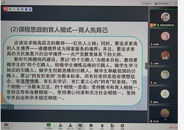 郑主任主要从“大思政”的内涵及理解、课程思政的育人模式“育人先育己”、课程思政的推荐方法及课程思政新教学模式四个方面分享了研修班的学习内容。 一是,“大思政”的内涵及理解。“大思政课” 是新时代加强和改进思想政治工作,提升人才培养能力的育人理念和工作方法;是深化课程思政,推进专业思政和学科思政的必然选择;是思政课、课程思政、日常思想政治工作同向同行,共同构建“大思政“工作格局内容、载体、途径的拓展与创新;为高校深化课程思政建设,健全“三全育人”体制机制,构建德智体美劳全面发展的高水平培养体系,落实立德树人根本任务提供了方法论指导。二是,课程思政的育人模式”育人先育己”。坚持教育者先受教育,多种途径提升教师思政水平和业务水平;高层次的教师“为红色人之师”;做严师,授课有自己风格,有信仰,用自己的正能量去影响学生;立志成为“大先生”,要以德立身、以德立学、以德施教。在课程思政工作中,教师要具有大格局、大智慧、大谋略。