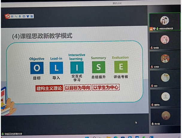 三是,课程思政的推荐方法。“三句话“,即做人做事的基本道理、社会主义核心价值观的要求、实现民族复兴的理想和责任。“三项基本功“,挖掘:备课时深入挖掘思政元素;有机融入:讲课时润物细无声;效果评价:课后反思。四是课程思政新教学模式O-LIS-E的介绍。O-LIS-教学模式五大关键环节(O—Objective目标;L—Lead-in导入;I—Interactive teaching交互式学习;S—Summary总结与提升;E—Evaluation评估与考核。