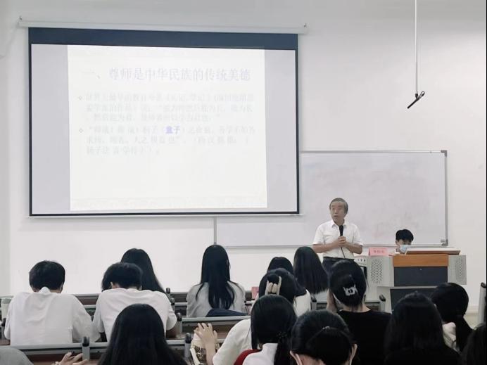 随后,李招忠院长认为,党和政府继承与发展了中华民族尊师的传统美德。他给同学们分享了我党历届领导人尊师的故事经历。毛泽东主席给恩师徐特立60岁寿辰时的致信祝贺;改革开放历史新时期,邓小平在教育界拨乱反正,力主恢复被文化大革命十年遭到损害的尊师重教之好传统;习近平总书记给初中恩师的充满感恩的回信,中共几代领导人用实际行动教诲我们要明白尊师的道理;改革开放以来,加强尊师教育立法,保障教师的各项权益,为中国的尊师制度提供了坚实的法律保障。