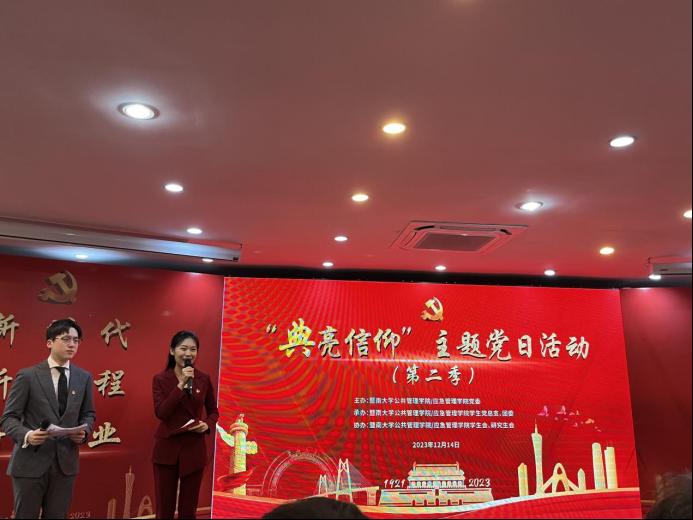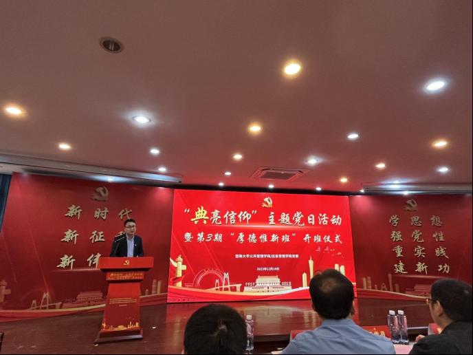 为深入开展学习贯彻习近平新时代中国特色社会主义思想主题教育,充分借鉴兄弟院校的发展理念和成功经验,广州华商学院管理学院党委组织员袁方方同志,学生第一党支部书记罗玉凤同志于2023年12月14日赴暨南大学公共管理学院/应急管理学院党委举办的第二季“‘典’亮信仰”主题党日活动暨第3期“厚德惟新班”开班仪式进行交流学习。