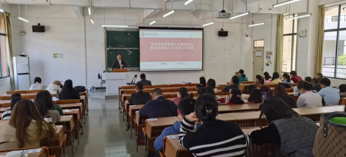 袁仕海副院长深入传达学校高质量大会会议精神,同时紧密结合学校高质量发展大会精神为管理学院全体教职工解读并传达2024年度工作计划及工作重点。管理学院2024年工作思路与目标:以学校高质量发展大会为指引,着力推动课堂教学质量的显著提升,推动学院实验室建设立项,努力实现国家级项目的突破,提升本科毕业论文的质量,积极扭转省级教学项目成果薄弱的现状,加强产教融合和创新创业工作,同时按照评估要求引进更多优秀人才,共同推动学院的发展和壮大。袁仕海副院长指出这一系列目标的实现将为管理学院带来显著的发展和进步,为教职工们创造更多的机遇和挑战。袁仕海副院长强调管理学院每位教职工都是学院发展的重要支柱和推动力量,通过集体努力和合作,学院将迎来新的成就和荣耀,实现共同的发展目标,从而为教育事业做出更大的贡献。