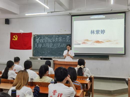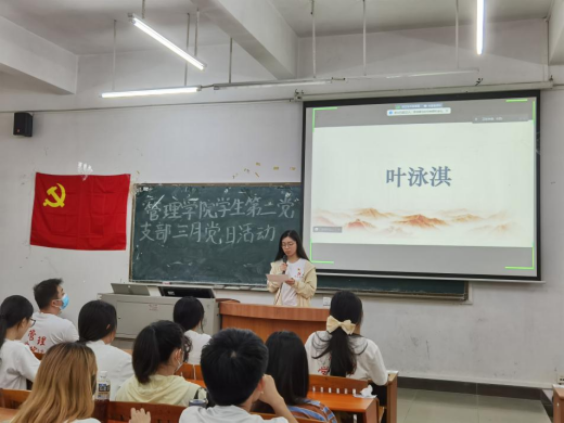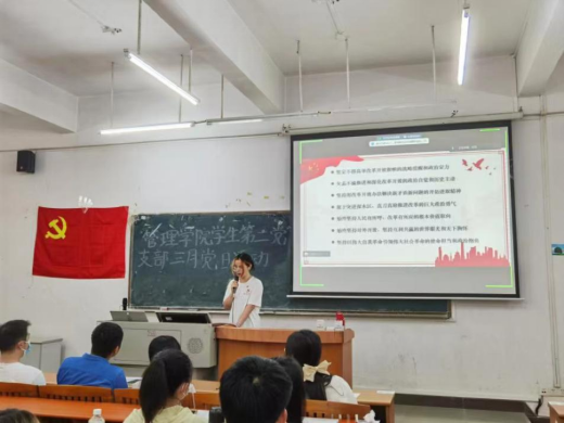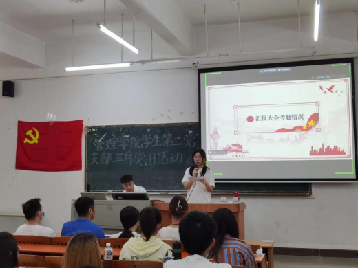 首先,主持人简单介绍了此次三月党日活动的流程,接着由管理学院学生第二党支部张思怡同志汇报本次大会考勤情况。