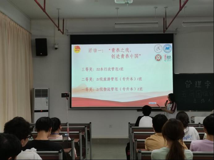 在“青春之我,创造青春中国”的活动中,荣获一等奖的班级是21级物流管理(专升本)2班;荣获二等奖的班级是21级旅游管理(专升本)1班;荣获三等奖的班级22级行政管理1班。
