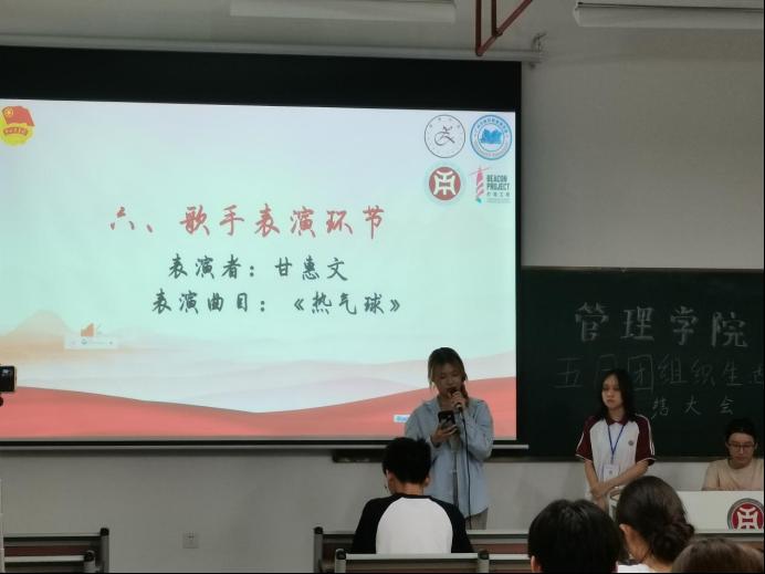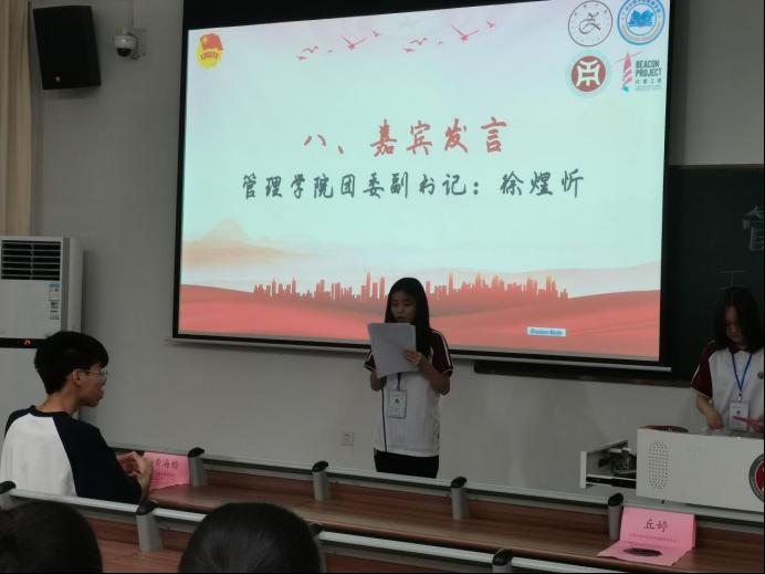 令人振奋的颁奖环节过后,由组织部工作人员莫晶晶代管理学院团委书记、管理学院学生会指导老师徐煜忻老师上台发言,为本月的团生活动做出总结,号召同学们立足当下、展望未来,在后续的日子中砥砺前进,创造青春中国!