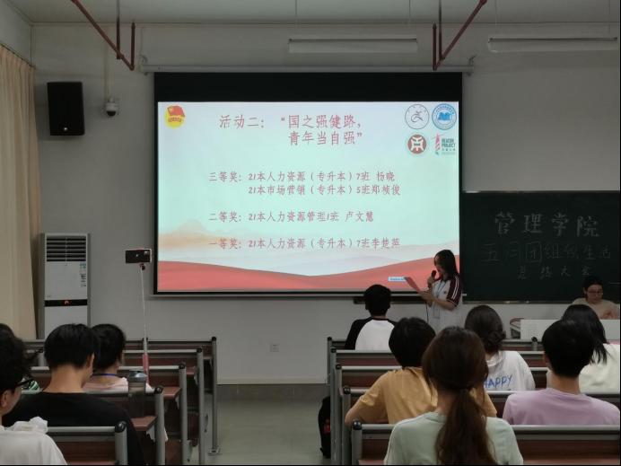 在“国之强健路,青年当自强”的活动中,荣获一等奖的同学是21级人力资源(专升本)7班李楚萍;荣获二等奖的同学为21级人力资源管理1班卢文慧;荣获三等奖的同学分别为21级人力资源(专升本)7班杨晓、21级市场营销(专升本)5班郑祯俊。