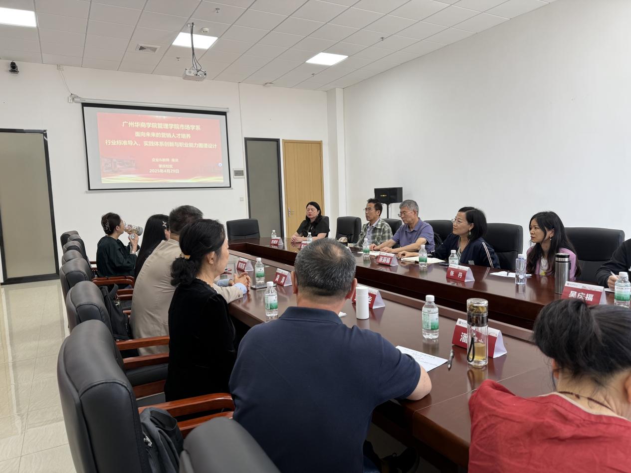 2025年4月29日上午,广州华商学院教学督导组秦陇一教授、管理学院教学秘书梁林海、管理学院市场学系主任张丽娟、副主任马航通,市场学系金明华教授、高环成教授、潘盛之教授、吴庆福副教授、贺嫦珍副教授、任欣鹭博士、张俊、张丹等一行12人前往广州华商学院肇庆校区,出席广州华商学院管理学院市场学系期中教师座谈会暨《面向未来的营销人才培养——行业标准导入、实践体系创新与职业能力图谱设计:企业&教师座谈会》。本次座谈会邀请了明美新能源集团韩晓英博士和拥有外企30余年工作经验的龚涛博士两位行业经验丰富的嘉宾,分享他们在新能源、快销品等领域的实践经验,为在场的教师们提供行业洞察。