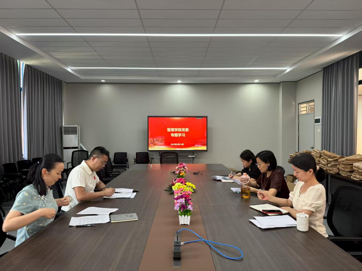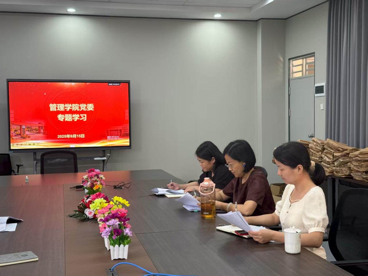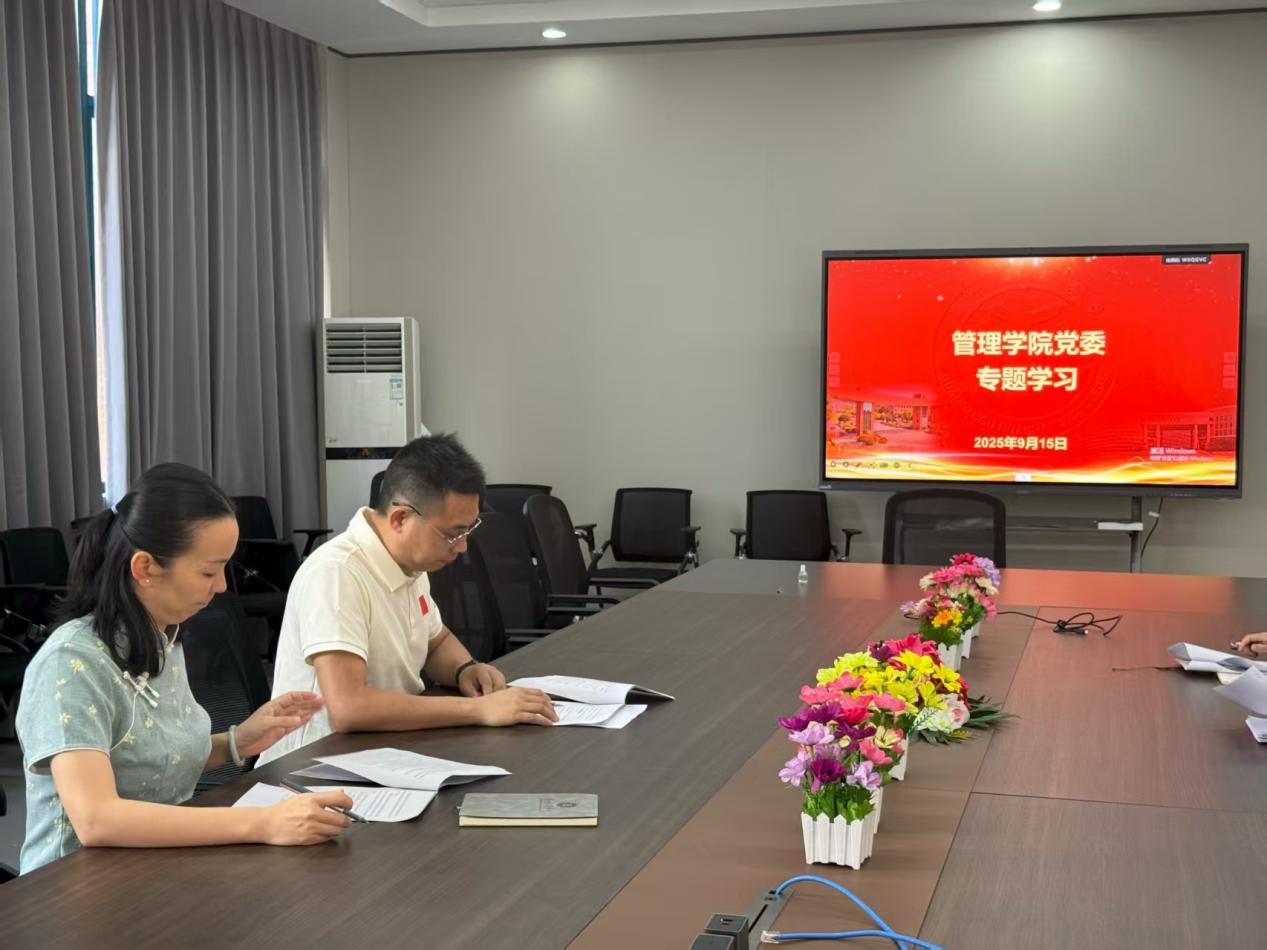 为深入学习贯彻党的重要理论精神,切实规范学院党委决策行为、提升治理效能,进一步筑牢思想根基、明确工作方向,推动学院党性建设、人才培养及各项事业高质量发展,管理学院党委召开 9 月第一次会议暨专题学习会。会议围绕党委议事规则展开深入研讨,并开展专题学习。出席本次会议的有管理学院党委书记袁仕海同志,管理学院党委副书记陈纯华,管理学院党委委员郑丽芬同志、潘思媚同志、张丽娟同志。