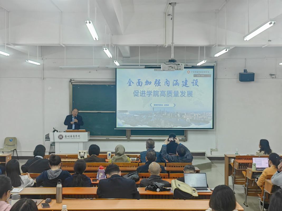 为全面迎接2026年教育部本科教学工作合格评估,扎实做好预评估各项准备工作,2025年11月4日,管理学院在广州校区与肇庆校区同步召开了管理学院诊断评估动员大会。会议系统阐释了合格评估的重大意义、核心要求与关键任务,全面部署了诊断评估阶段的具体工作安排,进一步统一思想、压实责任、激发干劲,为高质量通过教育部本科教学工作合格评估奠定坚实基础。刘少波副校长出席会议并讲话,袁仕海副院长作工作部署,史传林院长就评估工作进行总结和重点强调,学院领导班子成员及全体教职工参加了会议,会议由院长助理潘思媚主持。