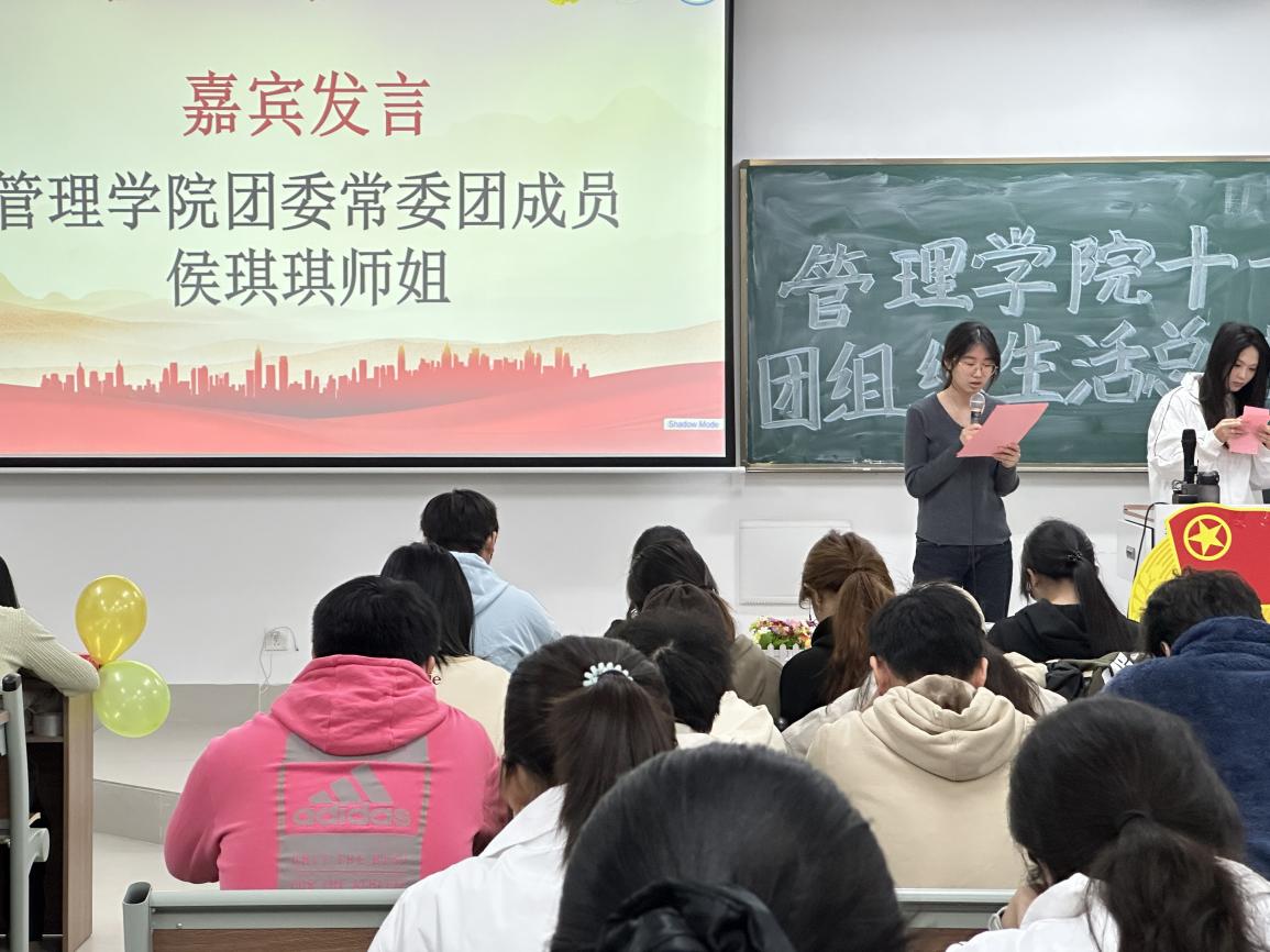 本次团组织生活总结大会由管理学院团委常委团成员侯琪琪师姐为本月的团生活动做出总结。侯琪琪师姐呼吁广大青年要深入学习党的二十届四中全会精神,用党的全会精神武装自身,并将其落实到我们的社会实践中来,在新时代的伟大征程中砥砺前行,既要为祖国做贡献,也要努力实现自己的人生价值!学姐的殷勤寄语引起了同学们的共鸣,大家用热烈的掌声表达了自己的支持。