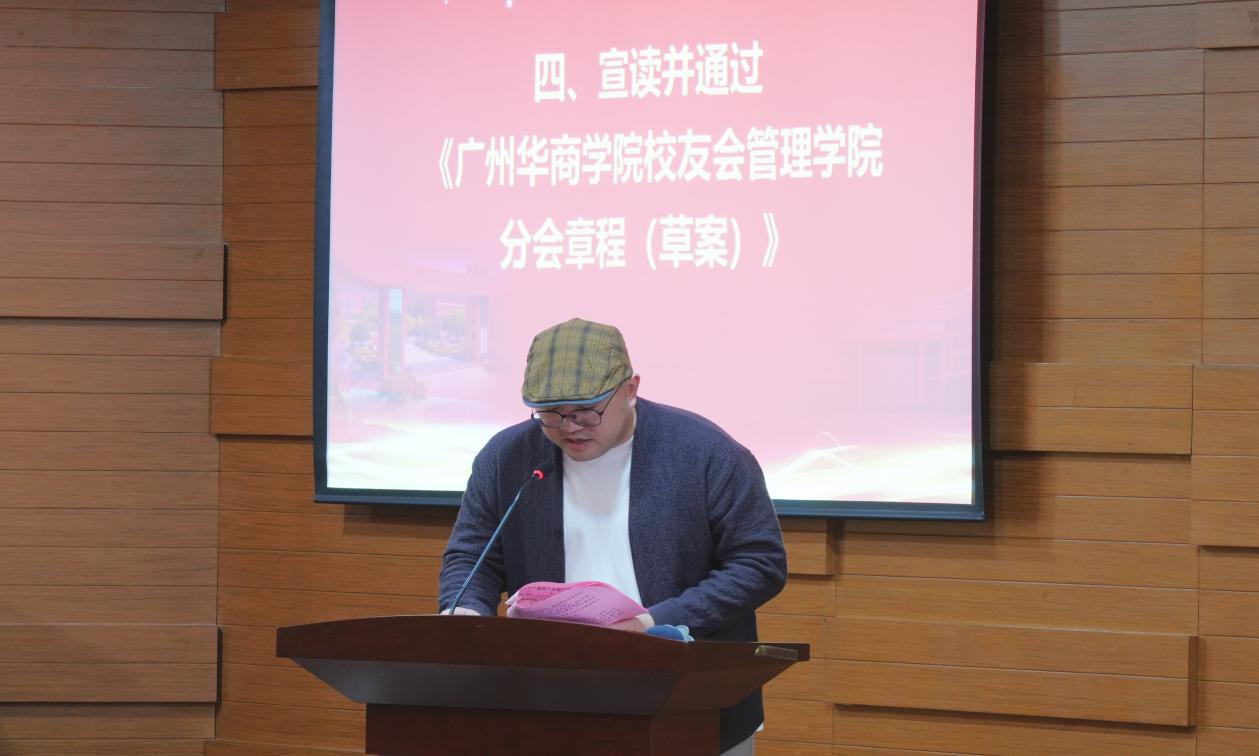 校友马列宣读了《广州华商学院校友会管理学院分会章程(草案)》并获表决通过,正式宣告管理学院校友分会的成立,全场响起热烈掌声。
