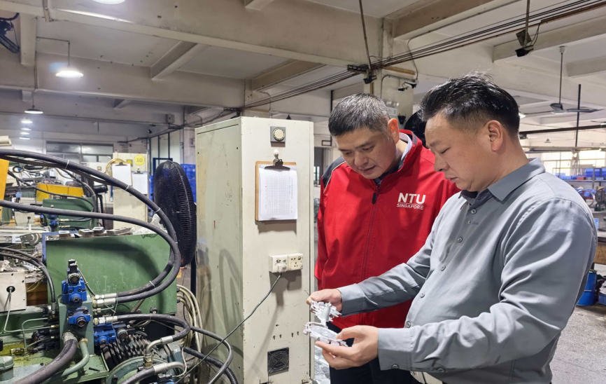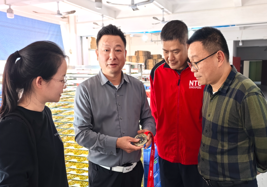 调研首站,教师团队来到天隆工艺制品有限公司。该公司成立于2008年,坐落于“中国五金城”中山市小榄镇,拥有占地40000余平方米的花园式工业园区,专业生产赛事奖牌、文创纪念品、各类活动奖杯等工艺礼品。企业相关负责人介绍,天隆工艺现有专业技术人员300余人,生产线24小时运转,日均产量达3万至4万个奖牌,年产量超过450万个,服务国内外大型马拉松赛事累计3000余场次。调研团队深入生产车间,实地观摩了从设计研发、模具制作、电镀工艺到成品包装的全流程生产线,详细了解了企业在原创设计、质量管控、物流售后等方面的精细化管理模式。
