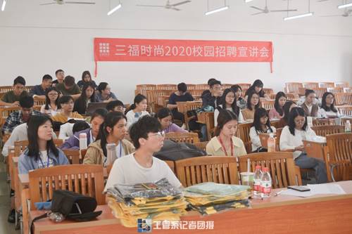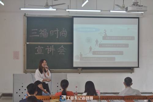 2019年11月12日下午2点30分,工商管理系校企合作基地广东三福服装有限公司招聘专场在励志楼C503顺利举行。工商管理系副主任秦陇一教授,物流管理专业讲师崔运玲老师、陈岫老师和林纯老师都参加了本次招聘会。本次招聘会大约举办了1个小时。三福时尚是一家主打快时尚的自主品牌服饰零售商,公司主旨为让年轻人轻松享受时尚生活,三福公司同样吸引了许多学生前来面试和咨询。