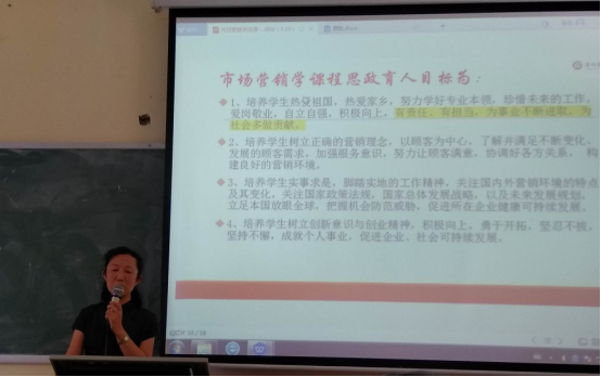 金明华教授在《市场营销学》课程中,强调要结合专业知识引导学生进行思考,培养学生热爱祖国,热爱家乡,努力学好专业本领,珍惜未来的工作,爱岗敬业,自立自强,积极向上,有责任、有担当,为事业不断进取,为社会多做贡献的精神。