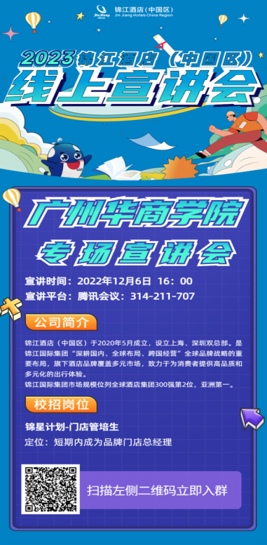 管理学院企业专场宣讲会之“锦江酒店(中国区)2023” 本次管理学院专场宣讲会,邀请到了知名企业“锦江酒店(中国区)”。由于疫情原因,本次宣讲会采用线上形式开展。公司将安排校招中心华南线路负责人马壮宾老师和宣讲官王喜娜总(维也纳国际酒店广州南站国际店总经理)参会。以下是本次线上宣讲会的宣讲海报和招聘推文。 招聘信息详情链接如下: https://mp.weixin.qq.com/s/XoLLZebYHO6DZdgXerF1pA 上一条:薪传廿载风华茂,才聚双选梦启航 2026届毕业生经管类专场招聘会圆满落幕! 下一条:访企拓岗促就业,产教协同稳攻坚 【关闭】