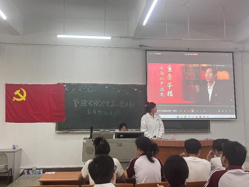 为深入学习贯彻党的重要理论精神,切实加强党员队伍作风建设,筑牢思想防线,夯实党的执政根基,管理学院学生第三党支部于2025年5月22日12点在励志楼C102开展了“悟论述要义强作风守规定底线固党基”主题党日活动,进一步加强党员队伍建设,强化党员作风,管理学院学生第三党支部全体党员同志参与了此次活动。