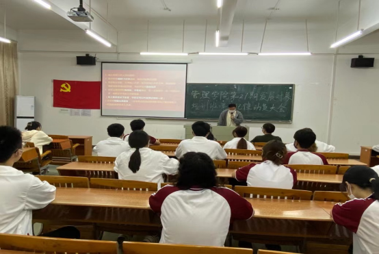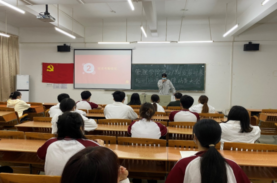 大会第四项,管理学院学生第四党支部副书记谭胜海同志发言。他首先祝贺了各位同志能够参加此次党课培训班,继续接受党组织的培养和考察。同时,他希望各位同志能够继续端正入党态度,严格遵守好党校培训班的纪律,服从组织管理,并祝愿大家都能顺利结业,早日成为党组织的一员。