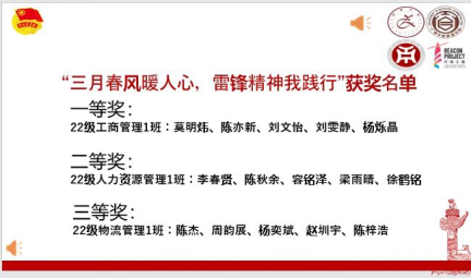 精彩的表演落幕,下面则是激动人心的颁奖环节,那就让我们瞧瞧,是谁的努力让奖项落入囊中呢。活动一“青春志愿心向党,雷锋精神代代传”的一等奖是22级工商管理1班;二等奖22级人力资源1班;三等奖22级物流管理1班、22级市场营销1班。