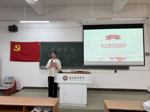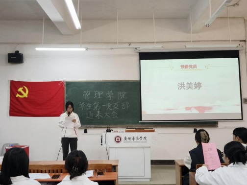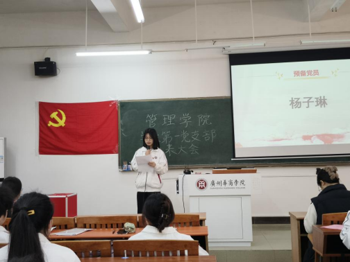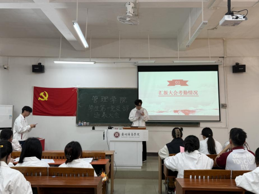 管理学院学生第一党支部纪律检查委员余瑞敏同志汇报大会考勤情况,并宣布通表大会正式开始。