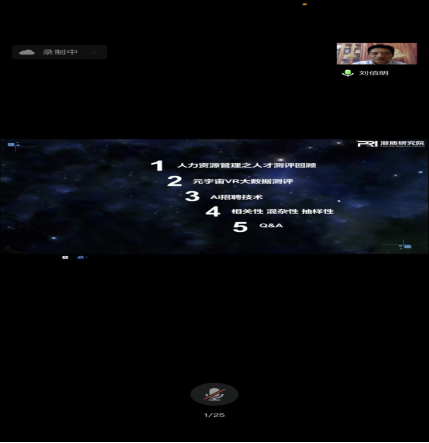 然后刘院长就正式开始了讲座,讲座分为五个部分,分别是:“人力资源管理之人才测评回顾”,“元宇宙VR大数据测评”,“AI招聘技术”,“相关性 混杂性 抽样性”,“Q&A”。从这五部分中,刘院长介绍了诸多前沿理论和技术。