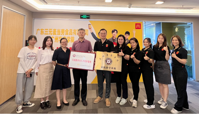 为深化产教融合、校企合作,探索校企合作的长效机制,2022年9月28日下午,广州华商学院管理学院副院长秦陇一教授、学院校企合作秘书曾惠玲老师、郑婷婷老师及学生代表一行前往广东三元麦当劳食品有限公司举行校企战略合作签约仪式暨教学实践基地挂牌仪式,共同开展产教融合项目合作及“校外教学实践基地”建设。