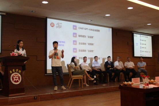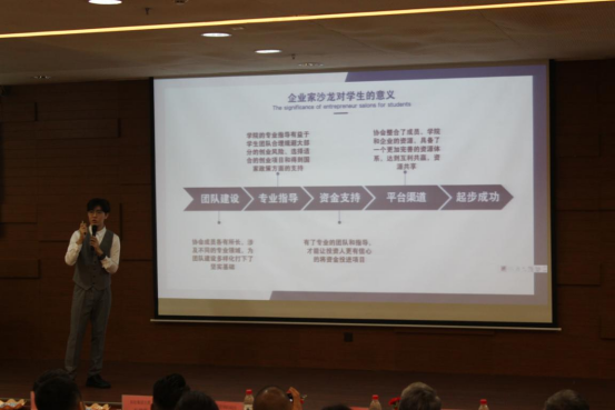 未来企业家沙龙协会会长、工商管理专业卫昊同学围绕自己真实的创业经历、学生创业难题和未来企业家沙龙对学生的意义等内容进行发言。他以大学生的视角介绍了企业家沙龙是一个以“引导+培养”自主创业的活动,是一个能使“1+1+1>3”达到最优解的活动,学院、企业与沙龙三方相结合,充分利用沙龙成员们的自主性与互助性,共同发展,为成员们搭建起创业的桥梁。