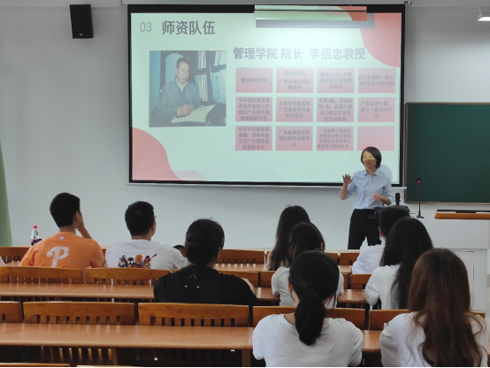 最后,张秀丽老师以往年行政管理专业学生就业率及就业方向等数据为例,为同学们讲解该专业未来升学、就业的方向,帮助同学们制定大学目标,合理规划未来。