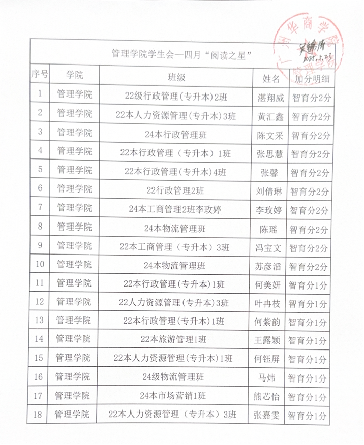 加分证明-管理学院——2025年四月阅读之星加分公示 加分证明-管理学院——2025年四月阅读之星加分公示 活动加分名单 百度网盘自行下载 本次加分证明为盖章版PDF 仅作公示,不支持任何修改 有需要的同学可自取,进行加分证明 编辑 | 管理学院学生会新媒体部钱芷坪 文字 |管理学院学生会学术部 初审 | 钱芷坪 复审 | 何雪盈 黄程洁 终审 | 吴锦涛 罗玉凤 上一条:广州华商学院管理学院学生会第一次全体大会 | 以青春之名,共赴责任之约 下一条:讲座预告|管理学院第二课堂系列活动:从广州华商学院,到世界百强名校,我是这样成长的 【关闭】