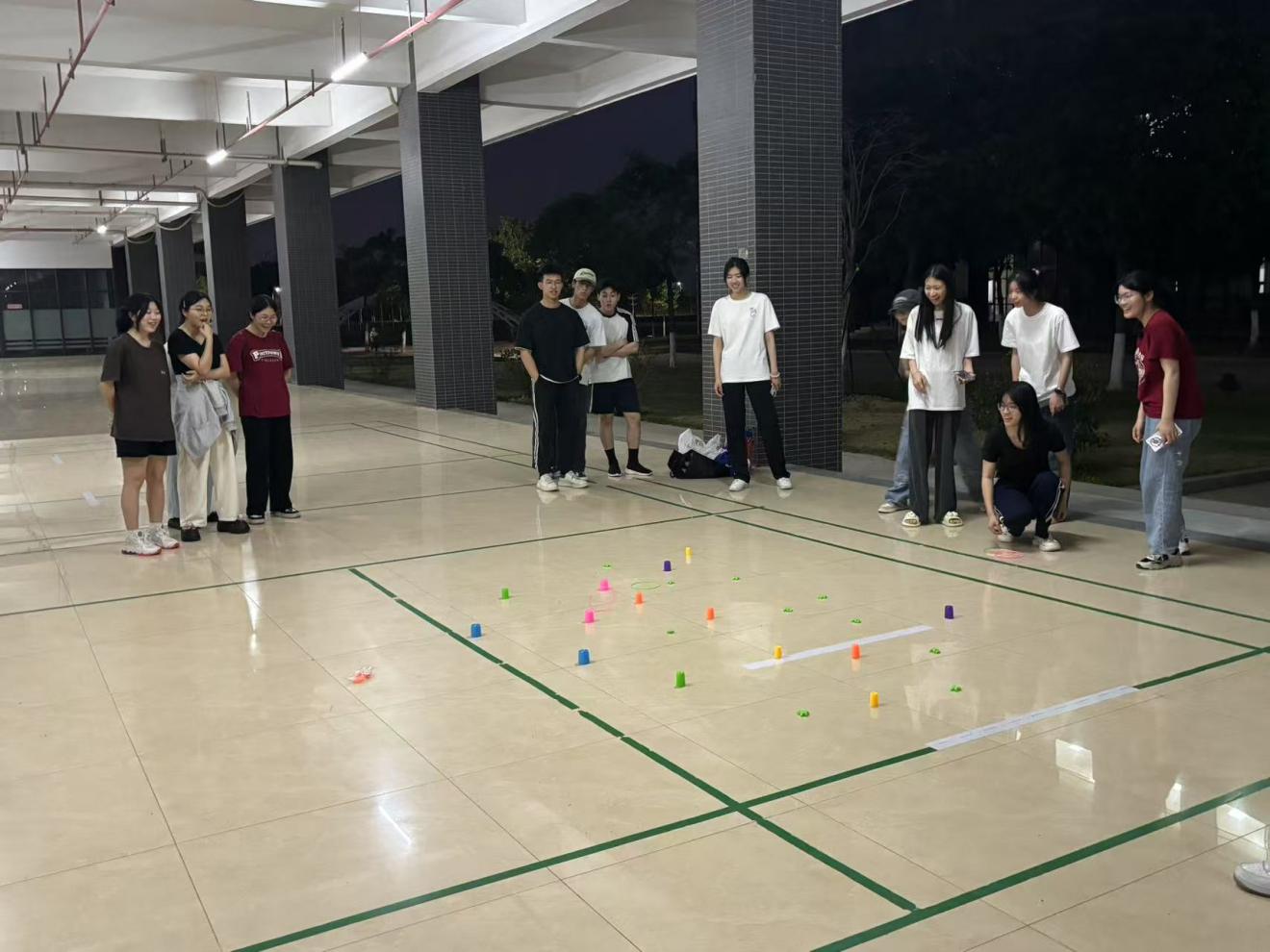 首先进行的是主题为“弘扬雷锋德,携手创和谐”的团生活动环节一。给每位参赛选手发放统一规格的套圈。选手站在规定的投掷线后,双脚不得踩踏或越过投掷线。投掷时需单手将套圈掷出,套圈必须在空中飞行,不得借助其他辅助动作。 根据奖品所处位置的远近和难度,设置不同分值,距离越远、难度越高的奖品分值越高。最终,统计每位玩家的总得分。第一名小组加8分,第二名小组加7分,以此类推,最后一名小组不加分。