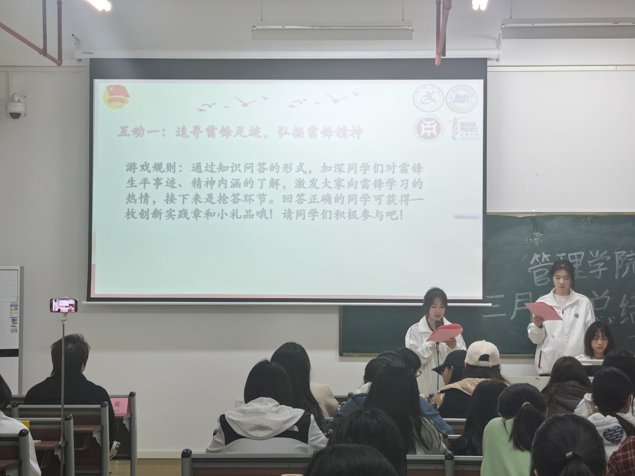 令人振奋的颁奖环节过后,由管理学院团委组织部关颖盈同学代管理学院团委副书记罗玉凤老师发言,为本月的团生活动做出总结,号召同学们传承雷锋精神,弘扬志愿新风,将雷锋的无私奉献与助人为乐化作日常行动!