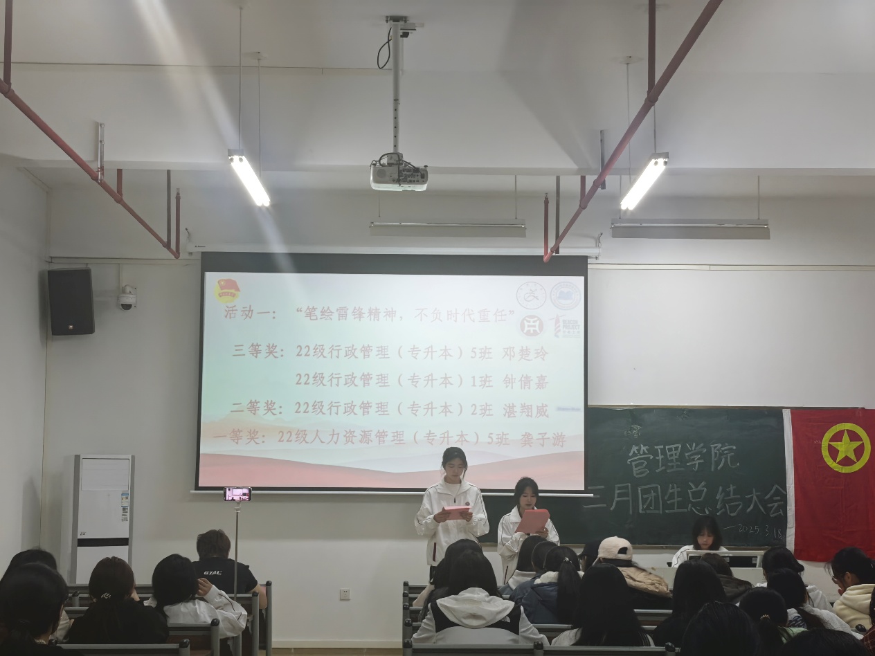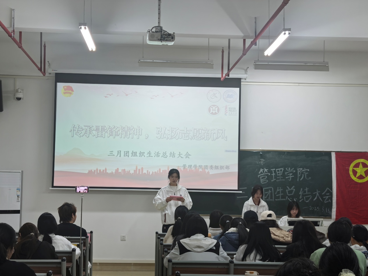 管理学院团委于3月18日晚上7时,在肇庆校区8号楼401教室举办主题为“传承雷锋精神,弘扬志愿新风”三月团组织生活总结大会,广州校区采用线上直播的形式同时举行。