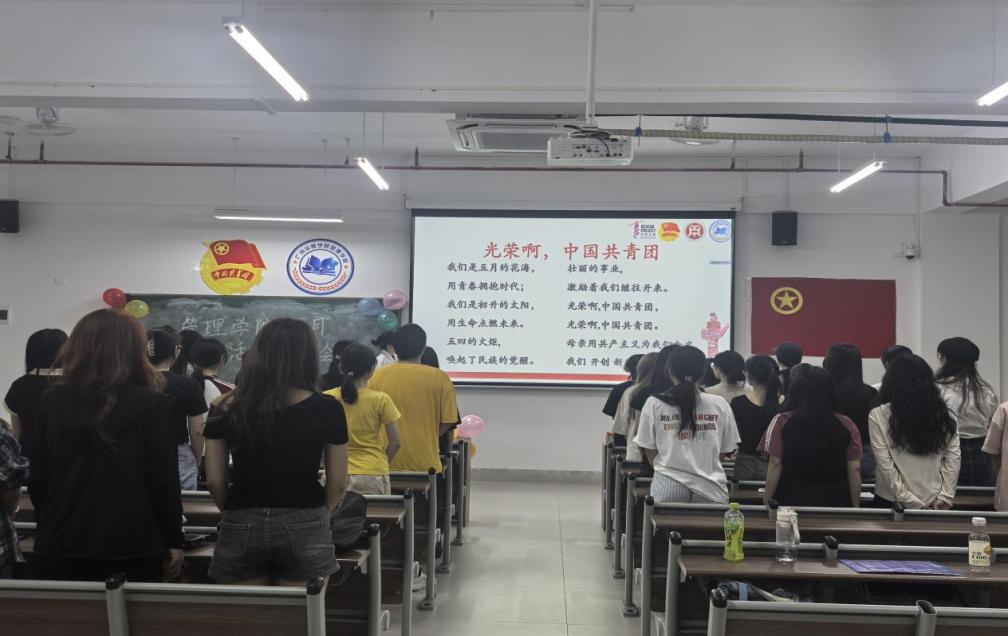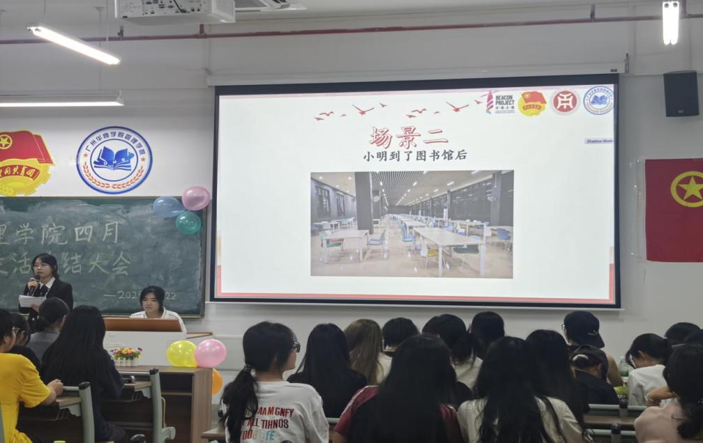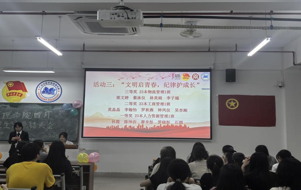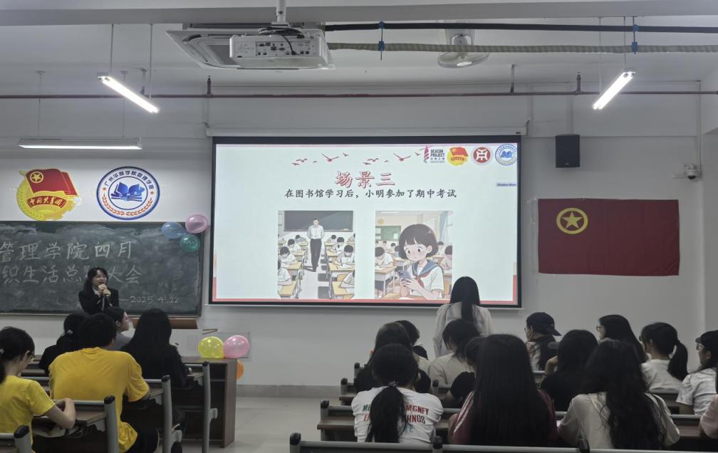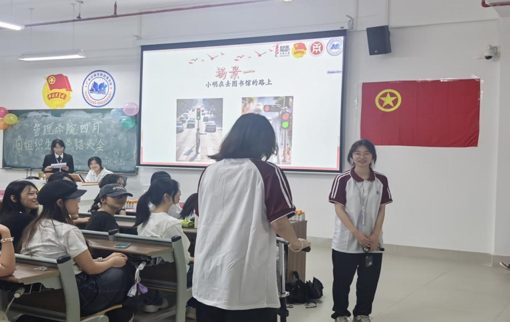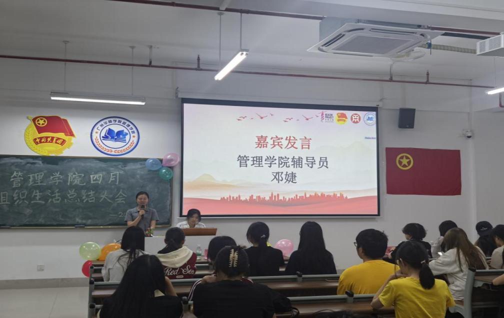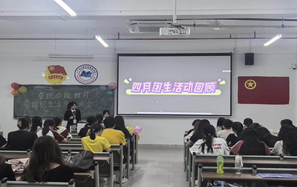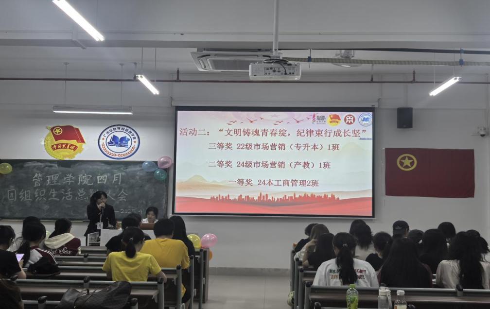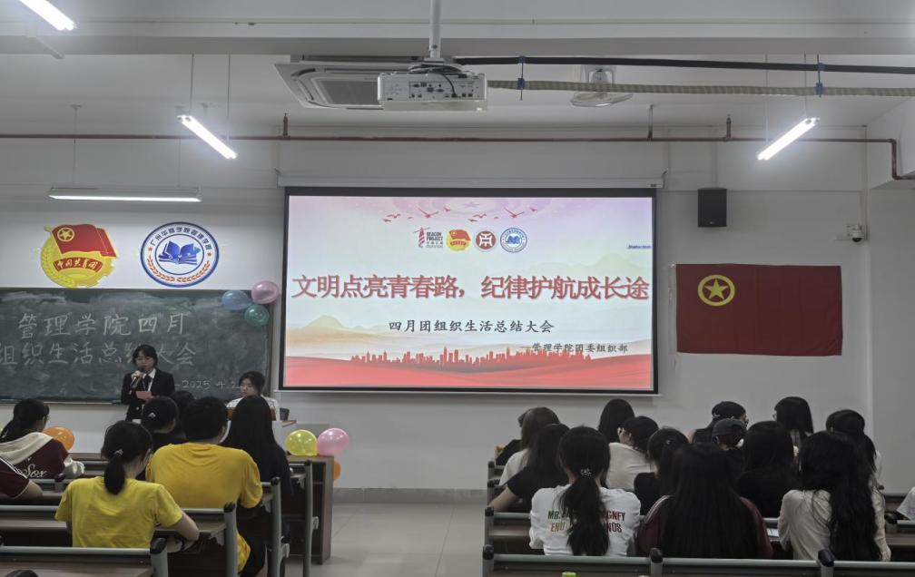管理学院团委于4月22日晚上7时,在肇庆校区16号楼408教室举办主题为“文明点亮青春路,纪律护航成长途”四月团组织生活总结大会,广州校区采用线上直播的形式同时举行。