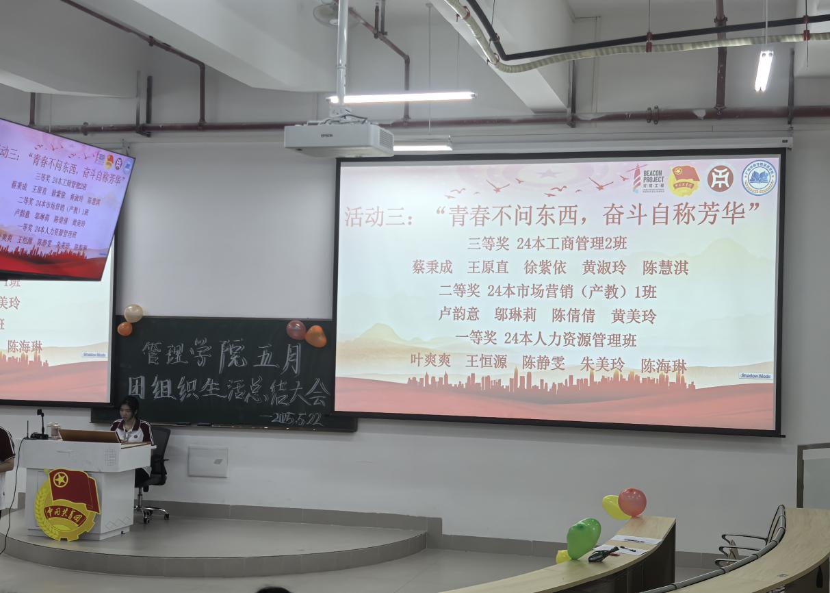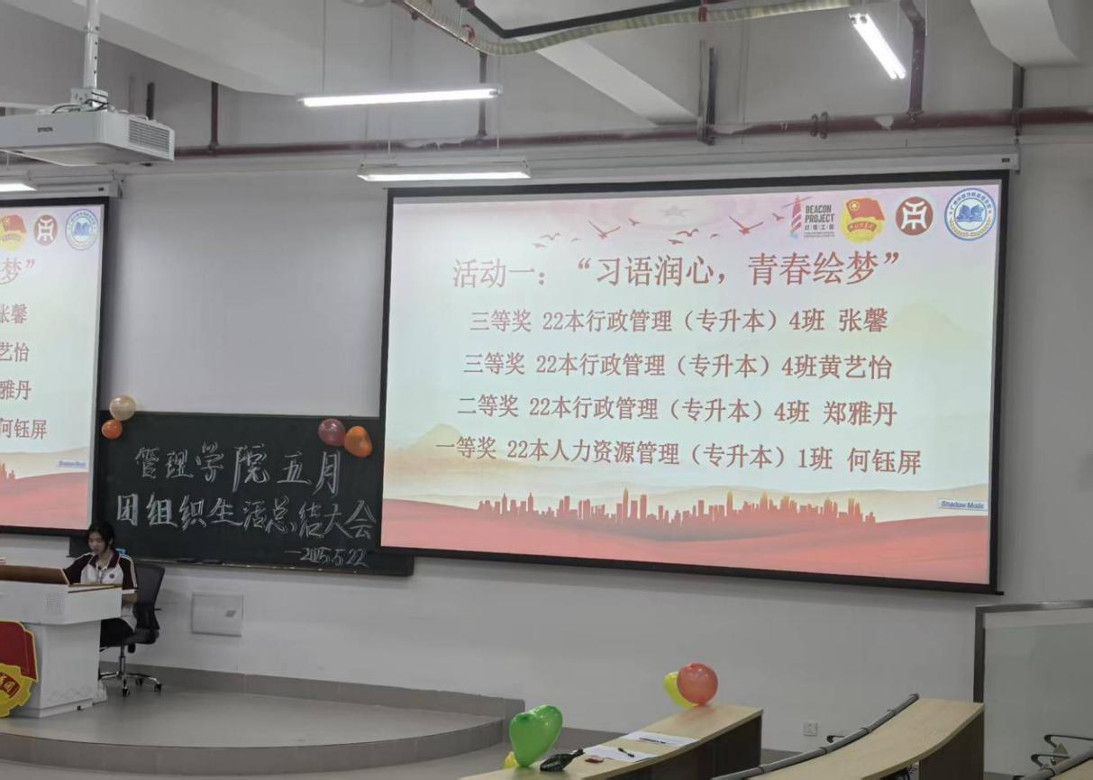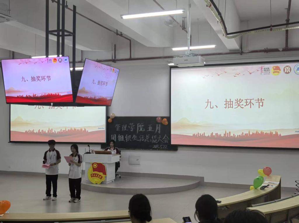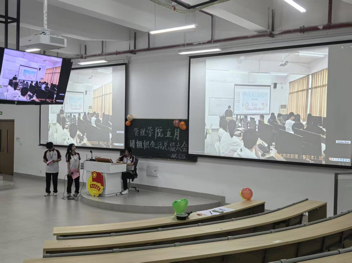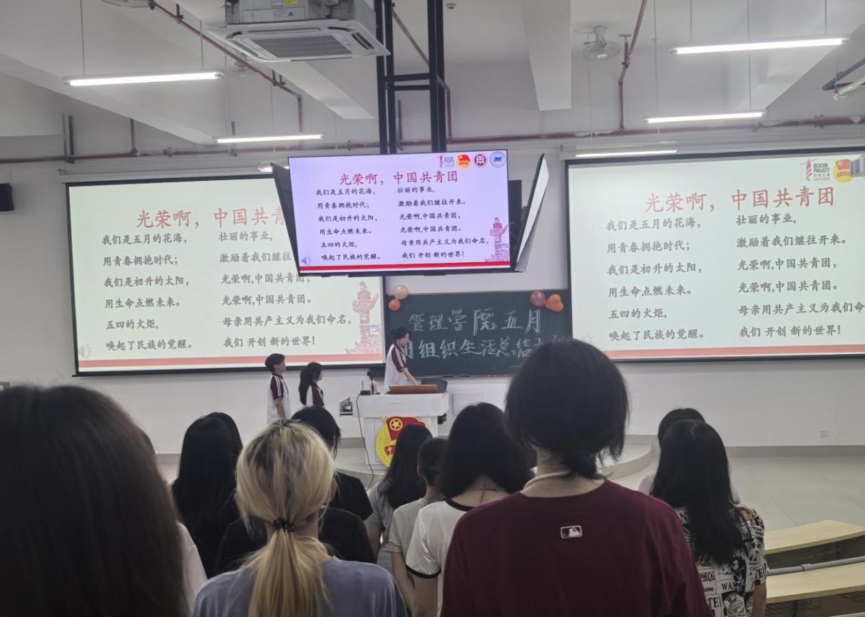 管理学院团委于5月22日晚上7时,在肇庆校区16号楼212教室举办主题为“青春为中国式现代化挺膺担当|青年领悟习近平总书记重要回信精神”五月团组织生活总结大会,广州校区采用线上直播的形式同时举行。