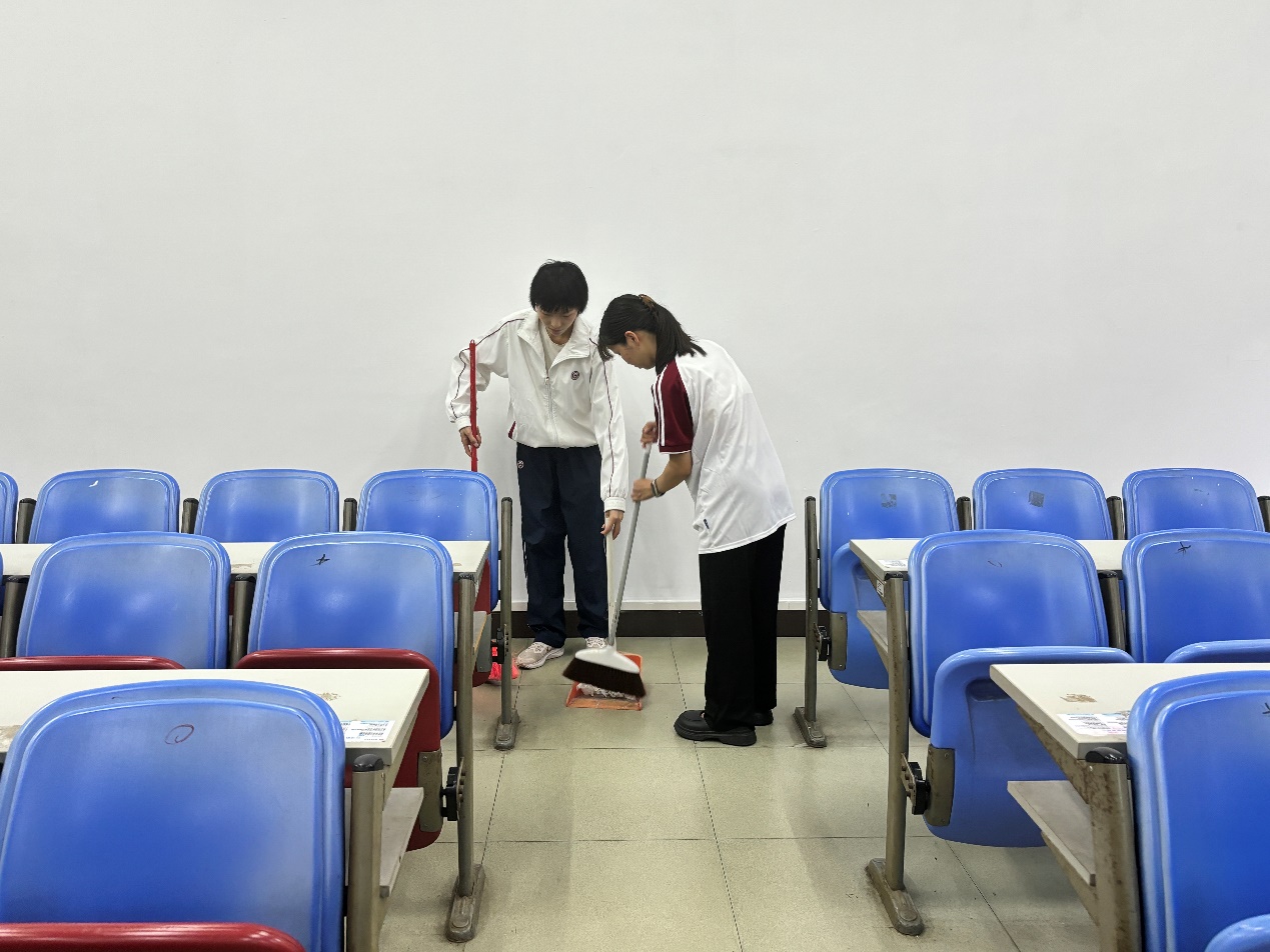 活动中,学员们化身为校园“美容师”,携带清扫工具对教学楼及校道进行深度清洁。在励志楼内,他们细致擦拭黑板、桌椅,清理桌面杂物与垃圾,确保学习环境整洁;在校道上,学员们全面普扫落叶、杂物,将纸屑、落叶等集中清扫至路边,不放过任何一个角落。大家相互配合、分工协作,在弯腰与擦拭间留下青春奉献的印记,以团队力量凝聚劳动共识。