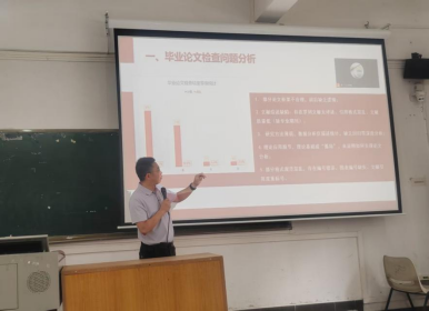 袁仕海副院长通报了毕业论文检查结果。在本次检查的参评论文中,C 等级占比 52.96%(975 篇),B 等级占比 39.01%(718 篇),A 等级占比 3.97%(73 篇),D 等级(不合格)占比 3.53%(65 篇)。检查发现论文主要存在五大问题:部分论文框架逻辑混乱;文献综述存在罗列文献无评述、引用格式混乱、专业期刊占比低等缺陷;研究方法薄弱,数据分析停留在描述统计层面,缺乏回归等深度分析;理论应用与论文分析脱节,理论基础未能有效支撑论点;格式规范混乱,存在编号错误、图表无编号、文献引用双重标号等情况。