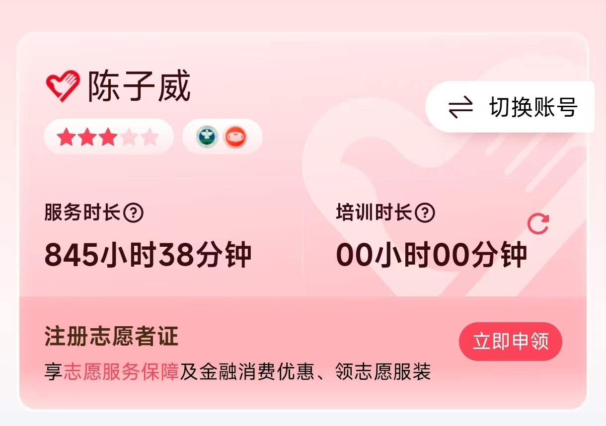 累计志愿服务时长达845小时38分钟,用脚步丈量责任,用行动书写青春答卷。