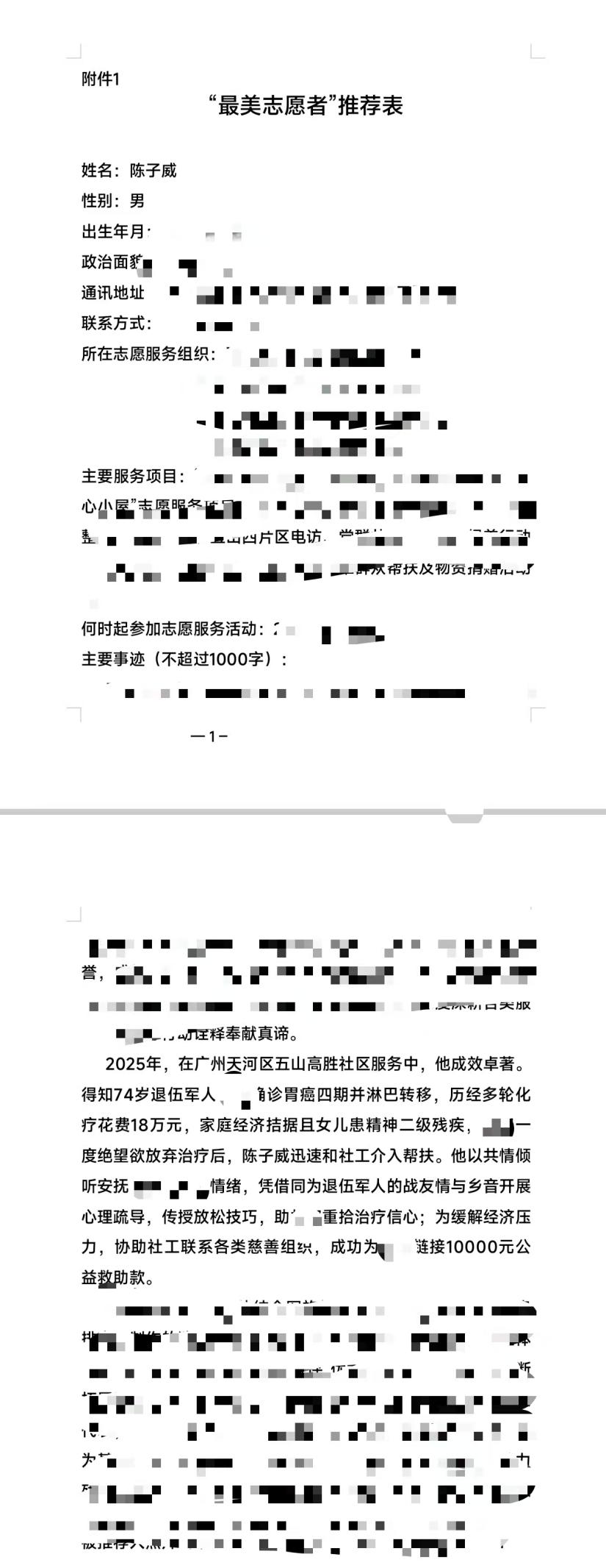在2025年社区服务中,他成效卓著:作为社区推选至广州市2025年度全国志愿服务“四个100”优秀典型的推优对象。我们在其最新的事迹中得知,他为困难人员链接的公益救助款总额达到了10000元。该帮扶事迹被报送至天河区相关部门。