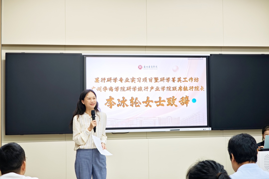 广州华商学院研学旅行产业联席执行院长李冰轮女士致辞。她介绍,学院与企业携手打造的研学菁英工作坊,以“理论—实战—数智”为核,精准锚定研学旅行这一高增长潜力赛道。工作坊将开展产品、运营、营销全链条实战训练,助力学员成长,有效淬炼其战略思维与数字化能力,并提供权威专业技能证书考取机会,全力打通学员从“学生”到“准职业人”的进阶通道,实现学业与职业的无缝对接。