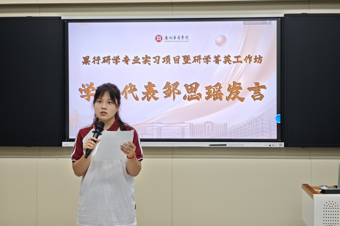 学员代表邹思瑶同学表示,研学菁英工作坊为学生提供了将所学所思付诸实战的宝贵平台。她期望借助工作坊“全链路”设计,完整经历研学产品从概念构思到市场落地的全过程,实现从“知识接收者”到“价值创造者”的转变,为大学生涯添彩,完成从校园学子到行业准专业人士的关键跨越,以更足的信心与底气迎接未来挑战。